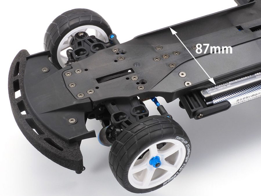 Angled battery and R/C equipment mean higher center of gravity and compact, lightweight chassis with optimal pitching and roll flex.