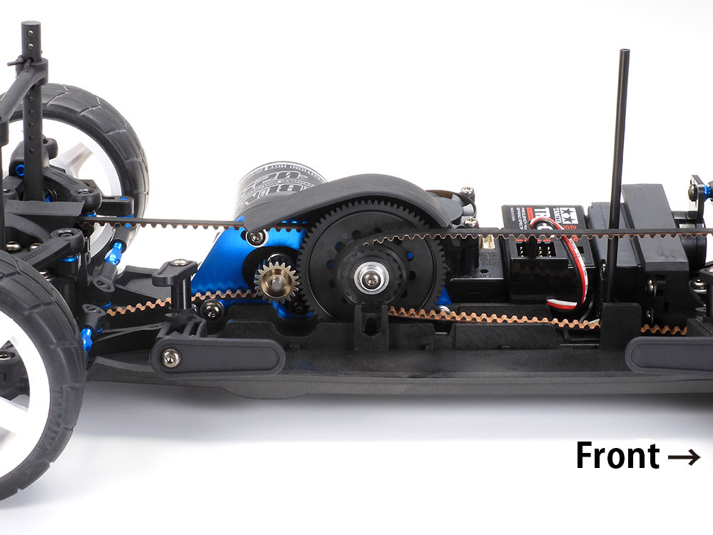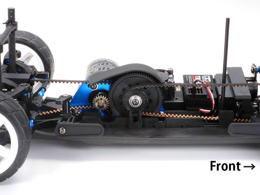 With spur gear ahead of motor, the chassis gives a stable drive, and belts are closer in length to facilitate minimal drive loss.
