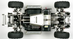 Positioned at the center of the High-Lift chassis and what is basically the heart of these trucks is the ingenious 3-speed transmission. It is designed so that you can shift the transmission via a third channel on your transmitter. A servo is mounted directly in front of the transmission and actuates an arm that engages the gears inside the tranny housing. As the name implies, there are three gears to select. From a very low torque gear up to a high faster gear. The beauty is that it can be shifted on the fly just like on a 1:1 truck. Assembling the transmission takes some time because of its complexity however, Tamiya’s instruction manuals are so good that you will end up with a properly operating tranny if you closely follow it.