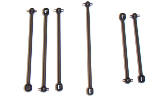 The B44.3 uses 3 different lengths of CVA bones. The 3 to the left are the front drivebones (x2) and a front-center CVA bone (x1), the long, center one is used for the center-rear CVA and the shorter 2 on the right are for the rear drive axles.