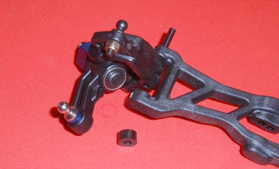 Slide a 2mm Factory Team aluminum washers onto the silver ballstuds and screw them into the inner hole on the camber link pad as shown. DO NOT OVERTIGHTEN or you will strip out the plastic. Snug is fine.