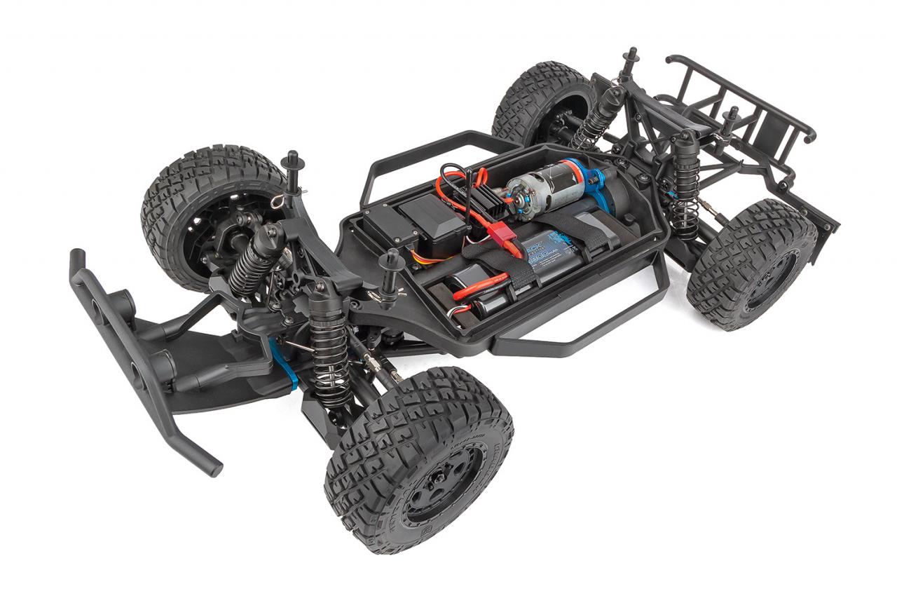 Team Associated’s Pro4 SC10 Ready-To-Run electric short course truck is both all show and all go. Features include the mighty Sport 550 Reedy Power motor, 3300mAh 2S WolfPack LiPo battery, a water-resistant enclosed receiver box, adjustable oil-filled coil-over shock absorbers, and four-wheel independent suspension. The gearbox includes heavy duty three sealed gear differentials. This short course proudly rolls and jumps on Fifteen52 Turbomac HD wheels wrapped in realistic off road General Tire GTR GrabberTM all-terrain tires.