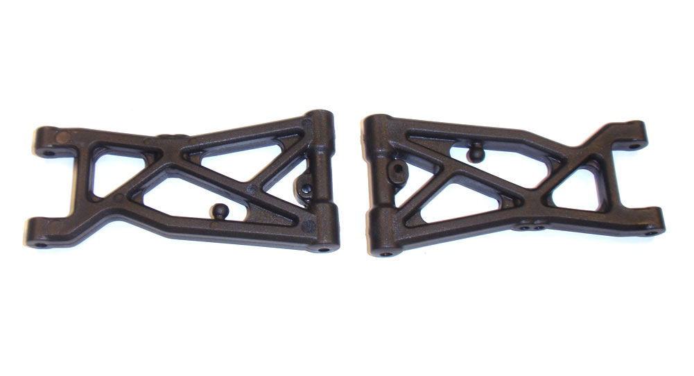 Check out the front suspension arms. The arm on the left is facing the right way (if the front of the car was facing up). The one on the right is incorrect. Using the one on the left as the guide, install a 3×10 setscrew into the droop hole. Yes, the manual states a 3x8mm, however the 3×10’s are used when building the anti-roll bar links and were a bit too long. The 3×10’s work better here for droop adjustment. Screw them in so an equal amount of thread is sticking out both sides of the arm. This is a good initial setting.