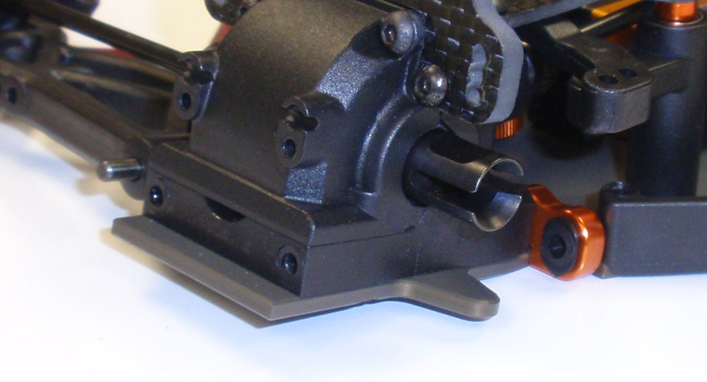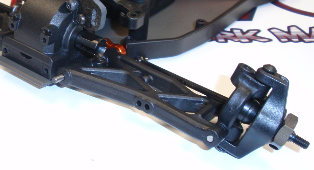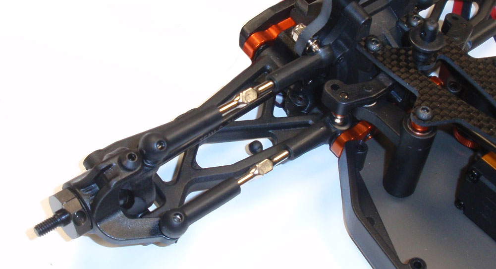 The Team C TM4’s front suspension is pretty standard, however it uses inserts in the arm mounts to adjust kickup and roll centers. It also features adjustable droop, however these screws are impossible to get to once the suspension is installed. Keep this in mind during the build.