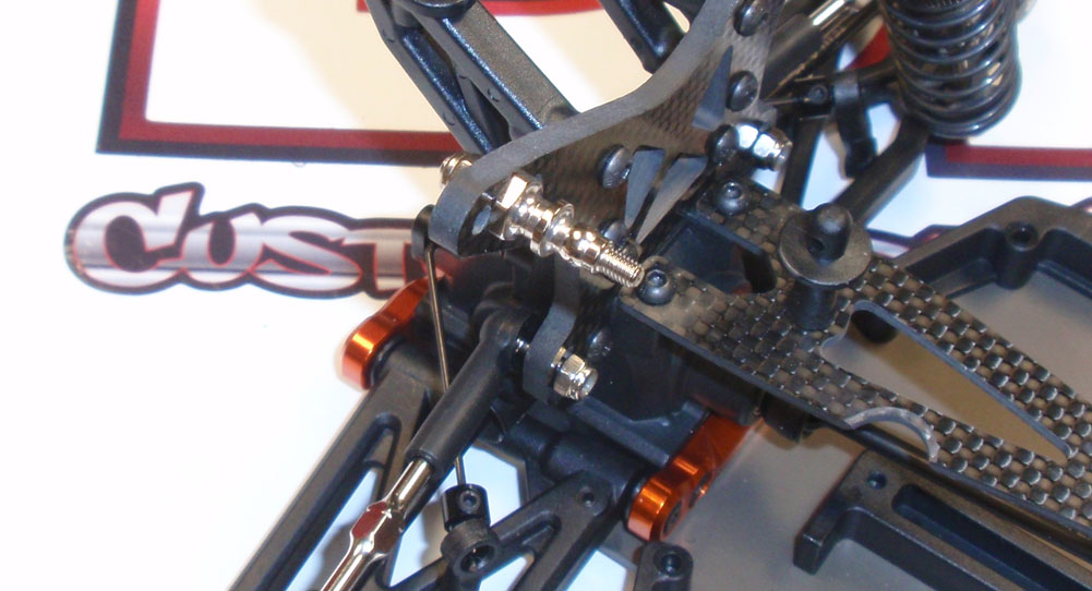 Position the shock in place and secure up top with the M3 nut. Mount the shock in the inner hole on the suspension arm.