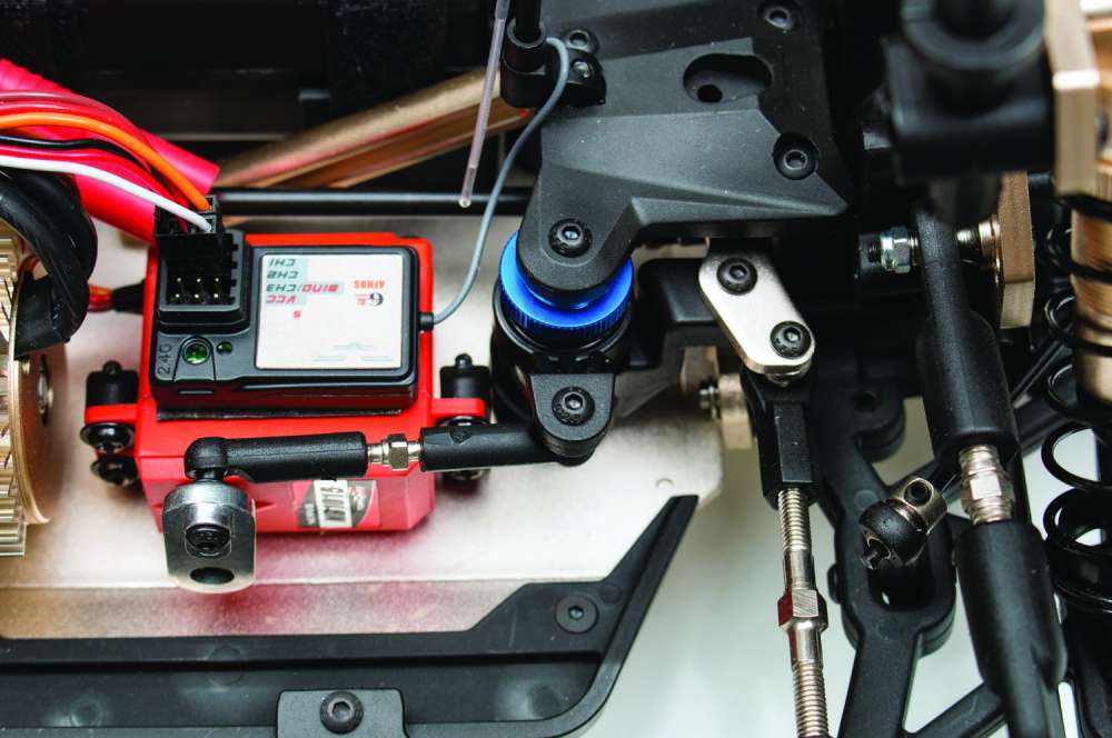 The steering system on the D10SS starts with the metal geared ND1015 servo. It is plenty quick and has 15kg of torque to push the tires from side to side. An aluminum servo horn (no plastic here) connects to an adjustable turnbuckle and to the dual bellcrank. The bellcrank has an integrated servo saver than can be easily adjusted with the blue anodized collar. Beginners might want to loosen this so it is more forgiving while more experienced users might want to tighten it down for a more precise feel. The bellcrank then attaches to the steering knuckles by way of long, adjustable turnbuckles.