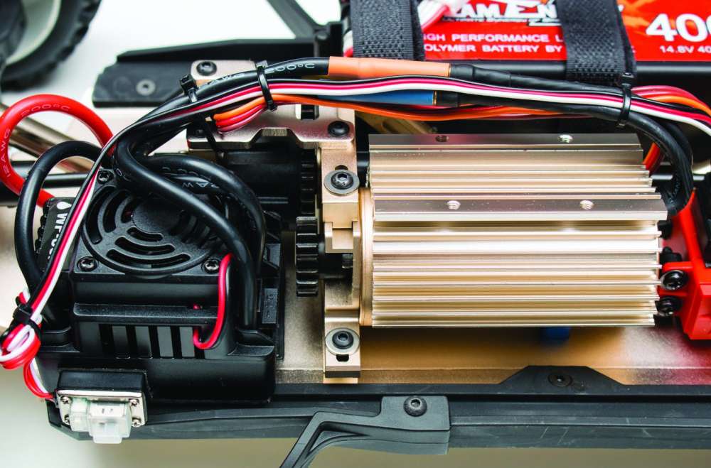 The electronics package in the D10SC is top notch too. The waterproof 100A brushless ESC was sourced from Hobby Wing and if fully programmable. It comes standard with a cooling fan to keep it running efficiently and connects to the battery using a high current connector. The 2400Kv 540L motor is encompassed by a cold anodized heatsink that has mounting holes to add an optional cooling fan. Other manufacturers should take a lesson from Team Energy and include a radio as good as the GT3X in all RTR vehicles. The included Gold Edition (only available with RTR vehicles) of the GT3X has a backlit LCD screen, 10-model memory, and has many options like basic throttle and steering trim, dual rate, EPA, EXP, sub trim and more. The power switch is found in an interesting spot, too… the center of the drop-down steering wheel!