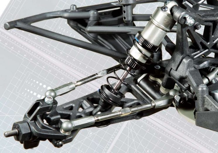 The steering assembly is a big change over version 1.0 as the new 2.0 comes with the crank style steering setup that TLR released and every 22 owner pounced on to upgrade their vehicle. The cranks are composite plastic supported by ball bearings that slide over a machined aluminum post. The composite drag link is compact and the steering servo links up with it via a short tie-rod. New offset rod ends are used for the right steering geometry and all the tie-rods and ends on the truck are the HD version for better durability.