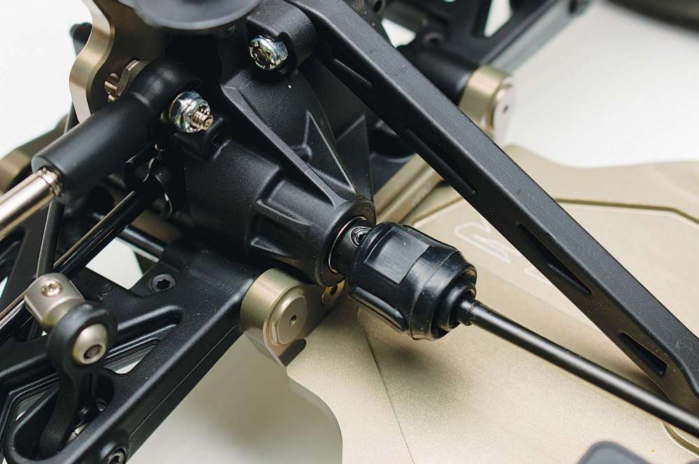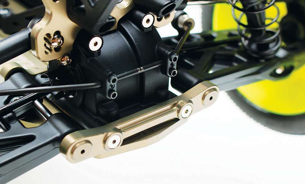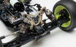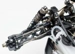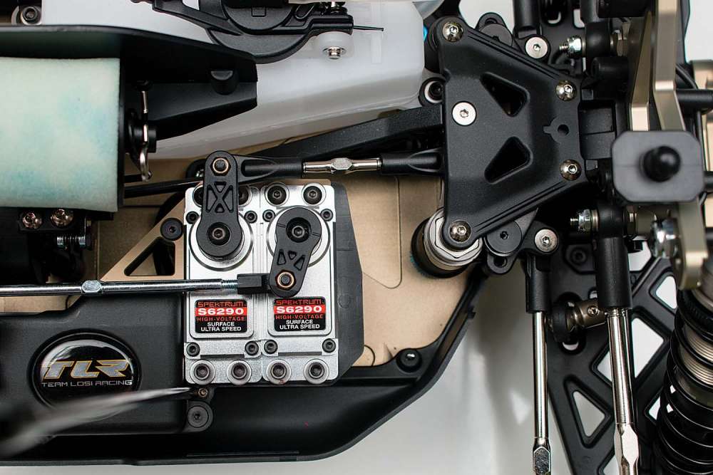 tray features the servo forward set-up, but now the throttle linkage arm has an upper brace to prevent the post from flexing under hard braking. The arm is ball bearing supported for smooth operation and