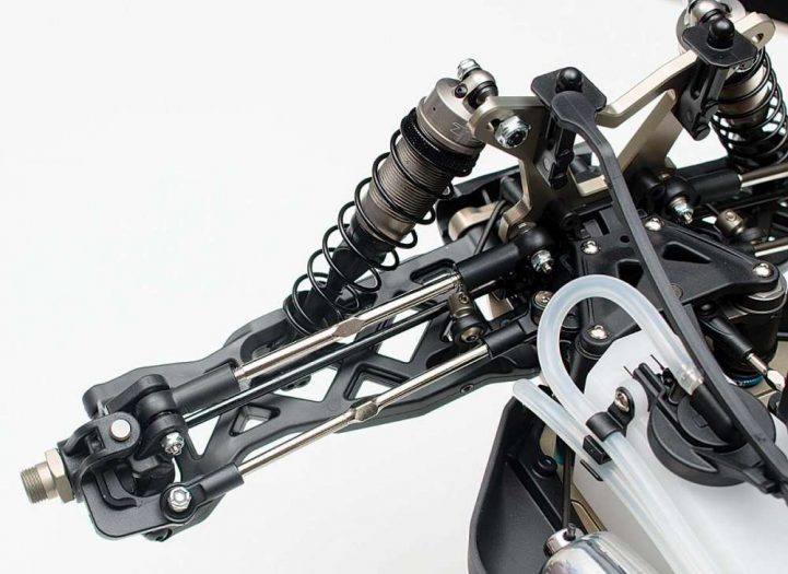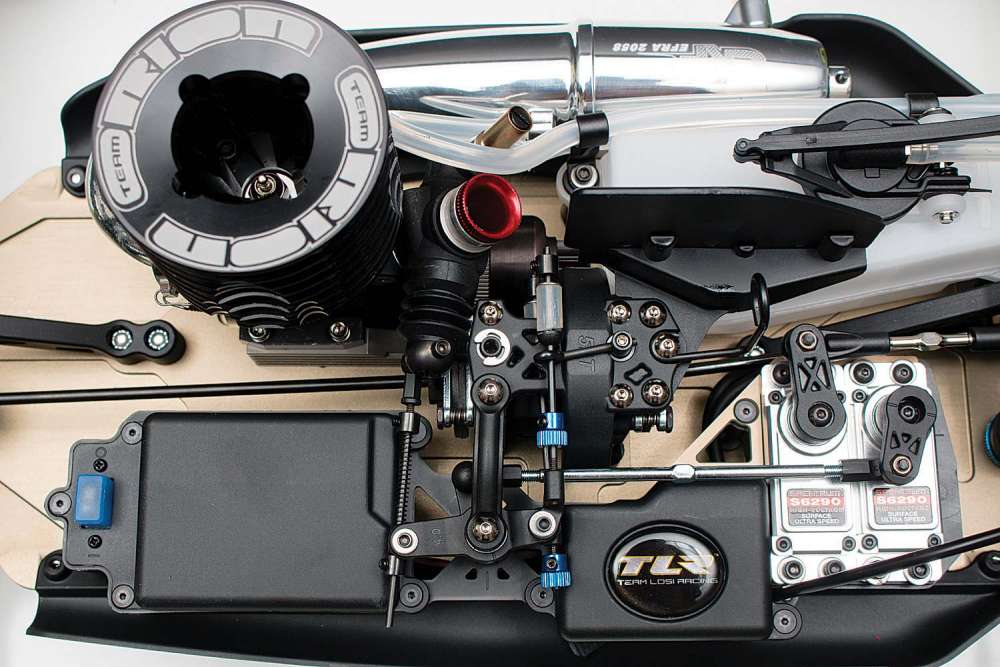 At first glance, it appears TLR carried the chassis over from the 3.0 to the 4.0, but don’t let that cool anodizing fool you. The new 8IGHT-T has a refined chassis plate that moves the engine over in order to realign the center driveline. Altering the position of the engine and drive shaft reduces the harsh angle of the front dogbone that would cause premature wear and add drag to the front. More power to the ground sounds better to me. Additional refinements to the 4mm 7075-T6 aluminum chassis include a larger engine mount footpad to reduce chassis flex in this critical area.