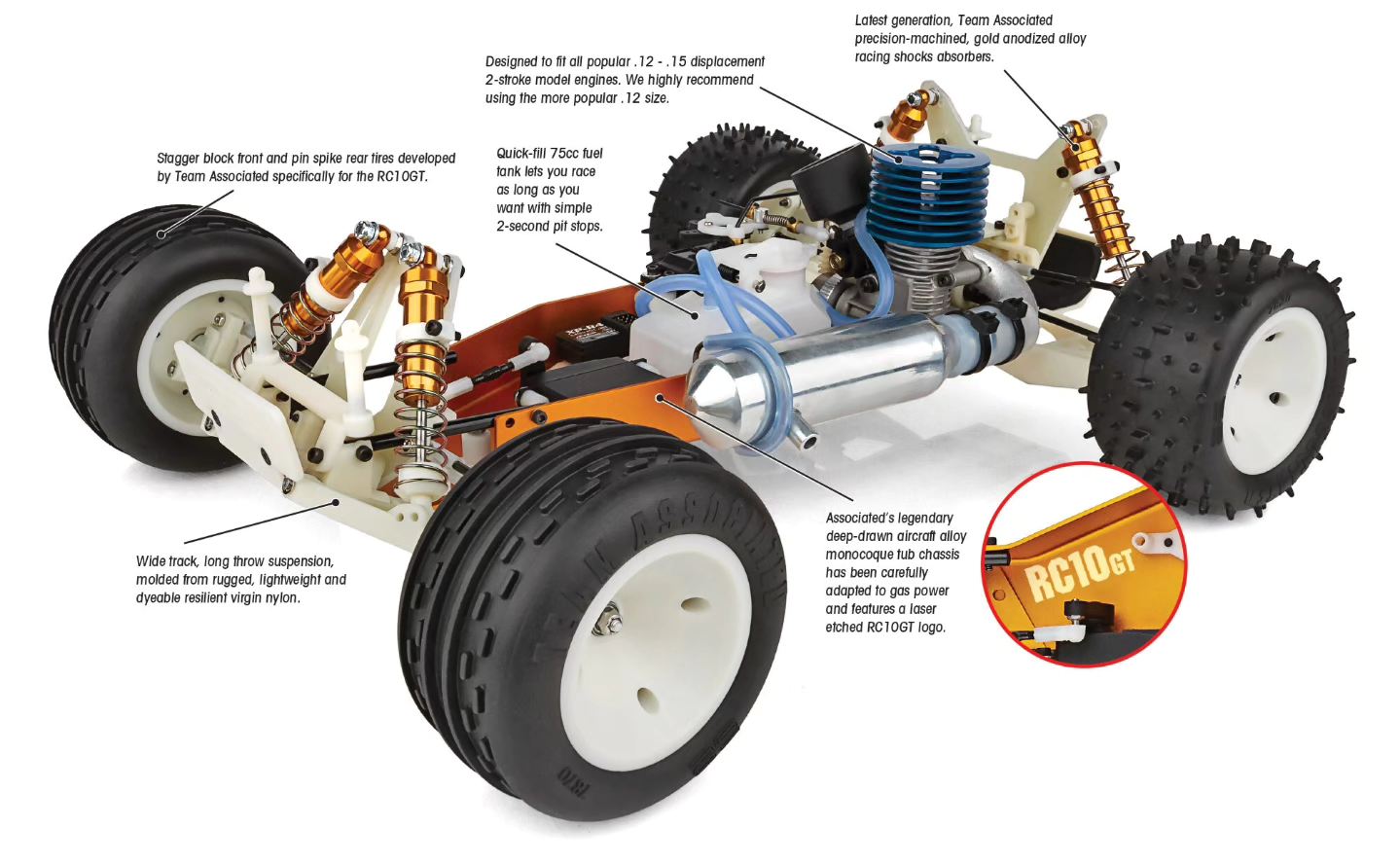 Originally released in 1993, the RC10GT changed the world and RC Racing by introducing nitro engines into the competitive world of RC Racing. With more wins than we can count, the RC10GT has forged itself as the most iconic gas truck ever created. Team Associated is excited to announce that the RC10GT lives on with this exclusive Gold Edition RC10GT.