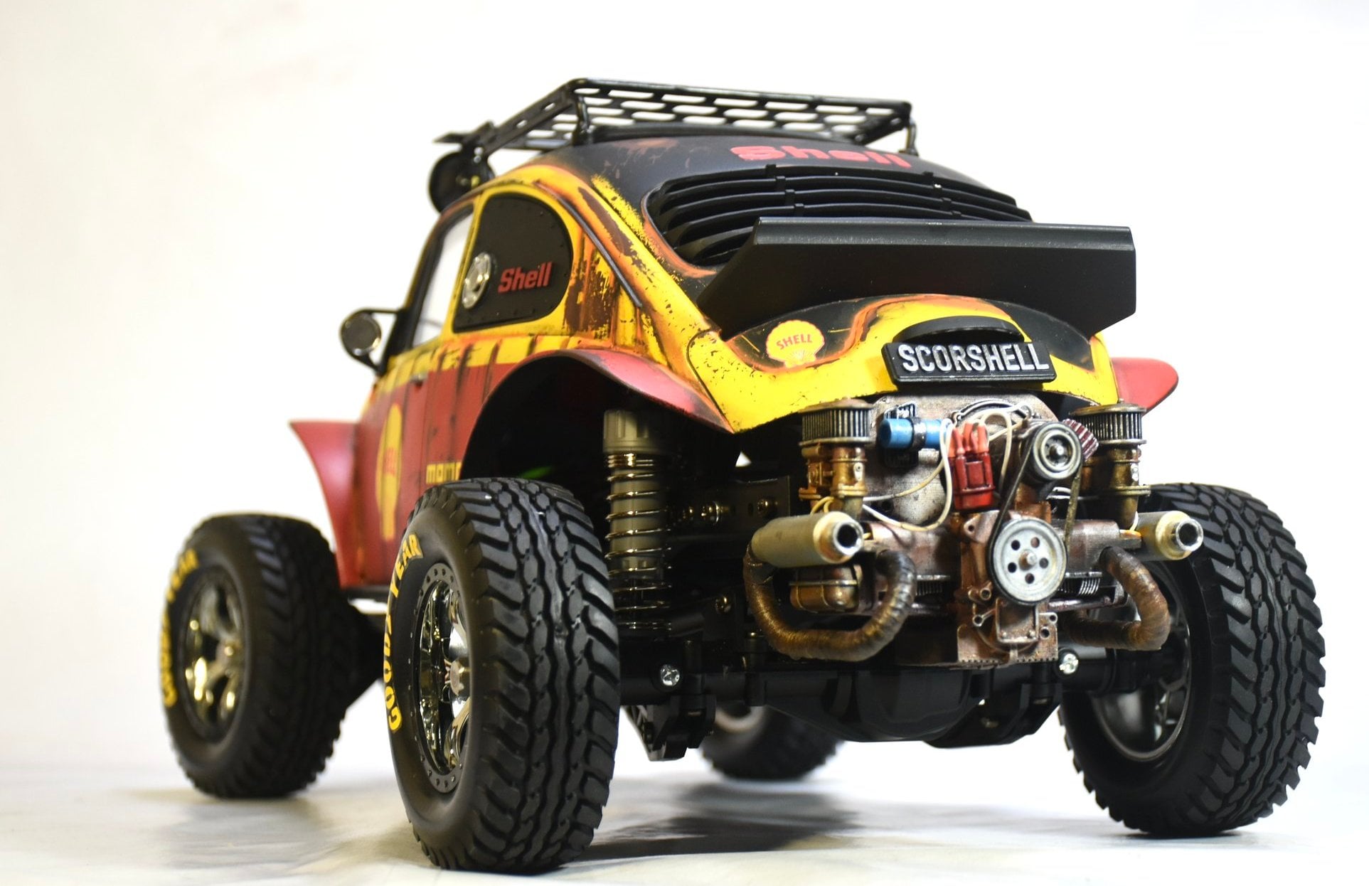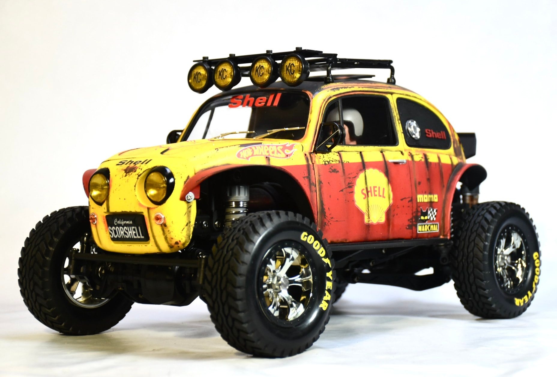 Following is an example Bruno created for the Tamiya CC-02 4WD truck chassis. It features a cool Shell livery with off-road baja theme complete with roof rack and lightbar.