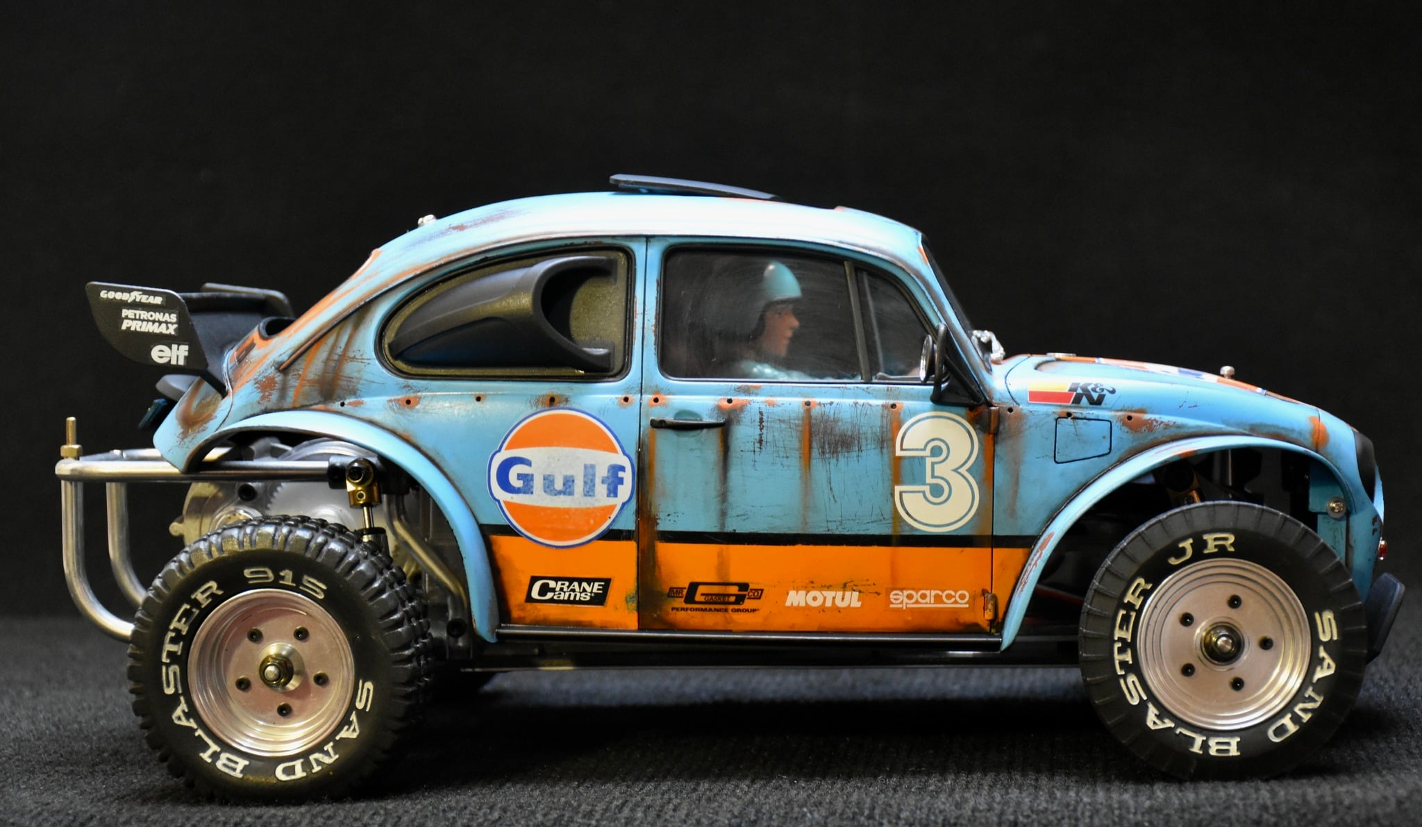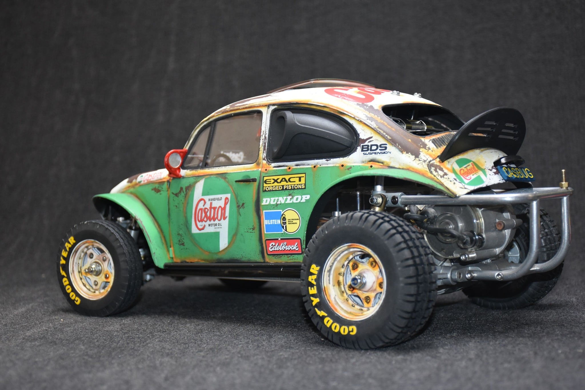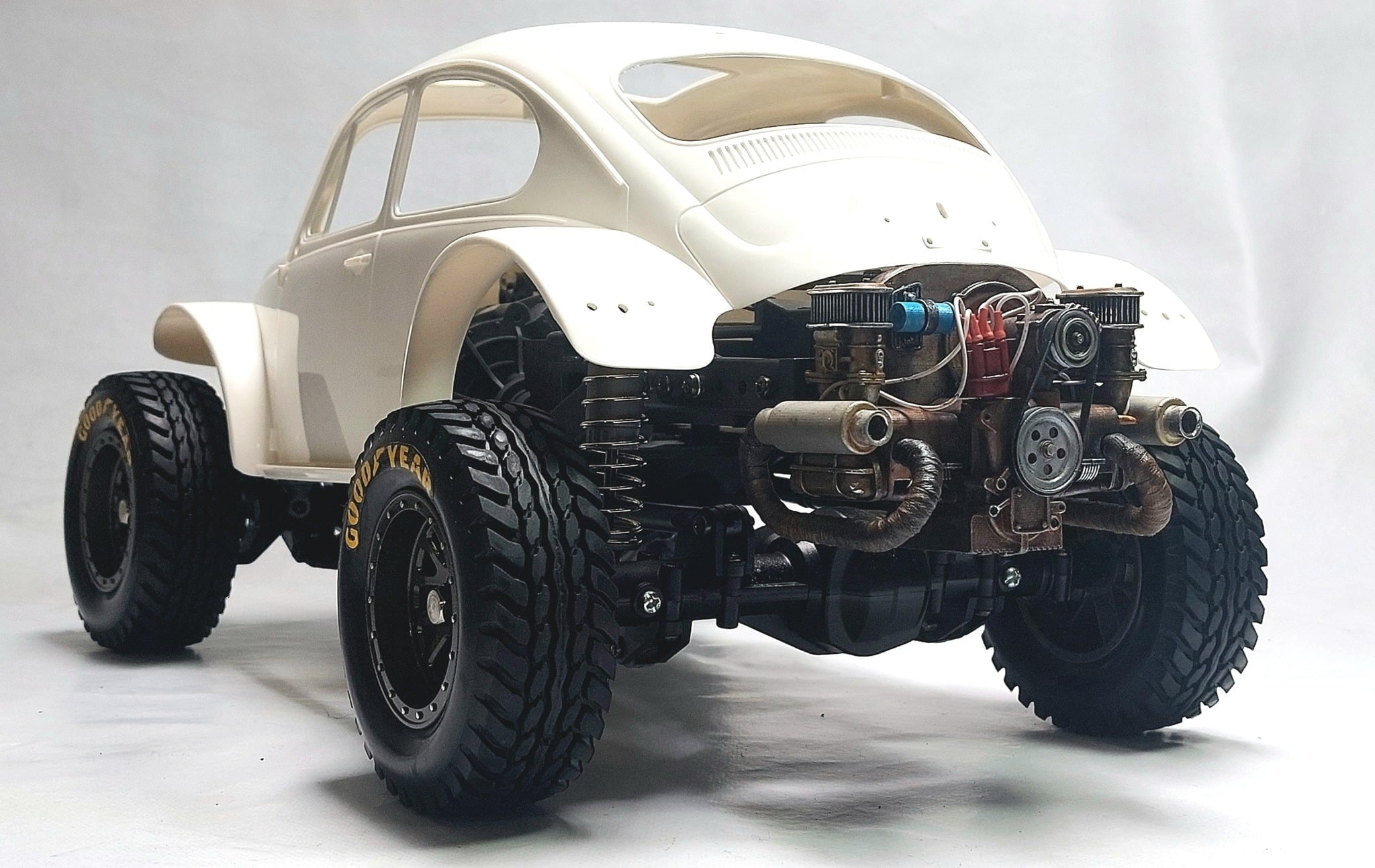 The wheels on this beetle is actually a wheel insert that Bruno designed and 3D printed. It is a great way to modify the appearance of stock Tamiya wheels.