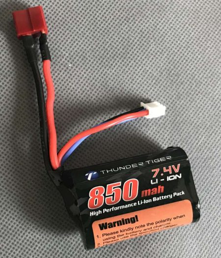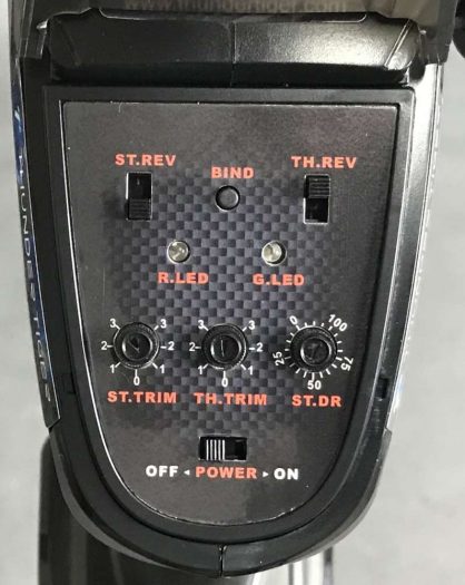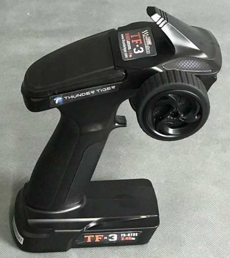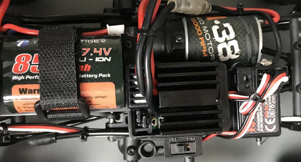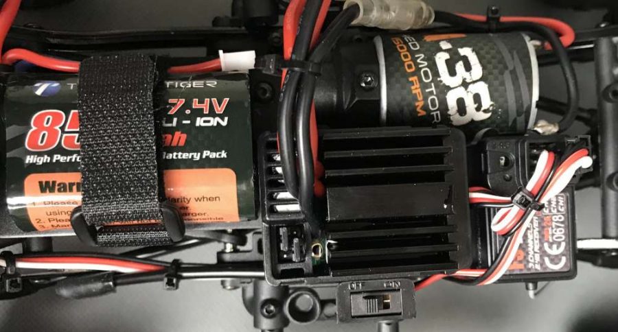 – For such a well-priced RTR the Thunder Tiger Toyota Hilux has a rather impressive electronics package. It all starts with a 2.4GHZ TF-3 transmitter equipped with basic steering and throttle trim adjustments as well as steering dual rate adjustments. The receiver is small, features a rather short antenna and is located near the esc. Speaking of the esc, it is a waterproof with black heatsink that uses jumpers/dip switches to change settings from lithium battery mode to NiMH mode and from trail truck mode with lots of drag brake to regular mode. Thunder Tiger Equipped the Toyota Hilux with an 850mAh LiIon battery and an easy to use wall charger to peak the battery pack. Just add 4 AA batteries to the transmitter and this trail truck is ready for action.