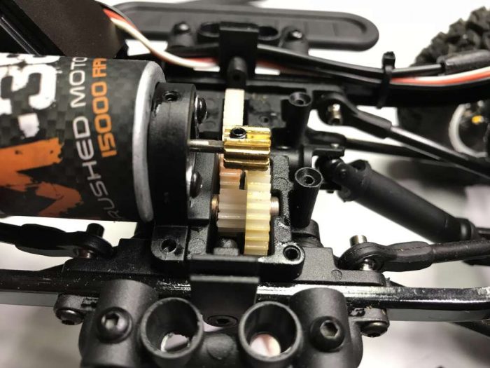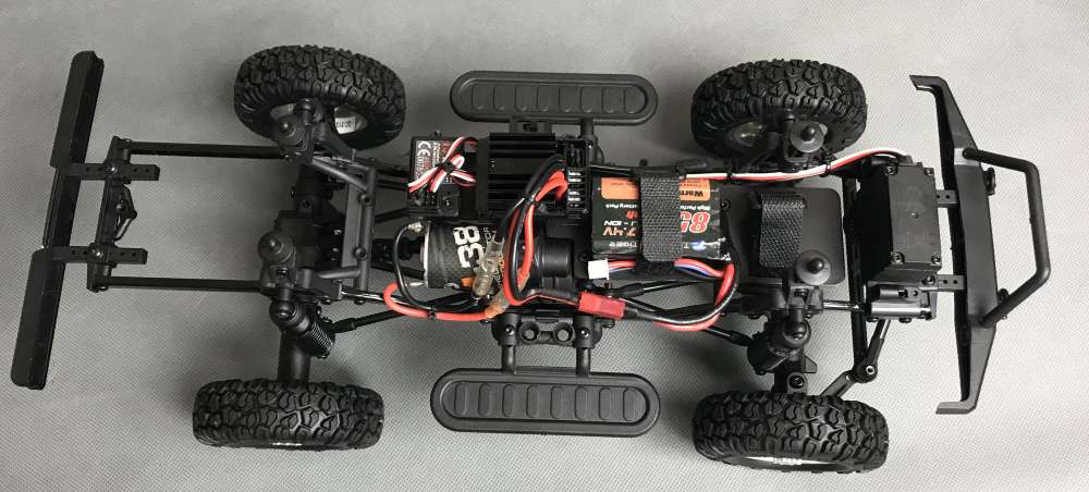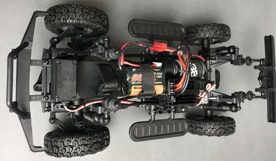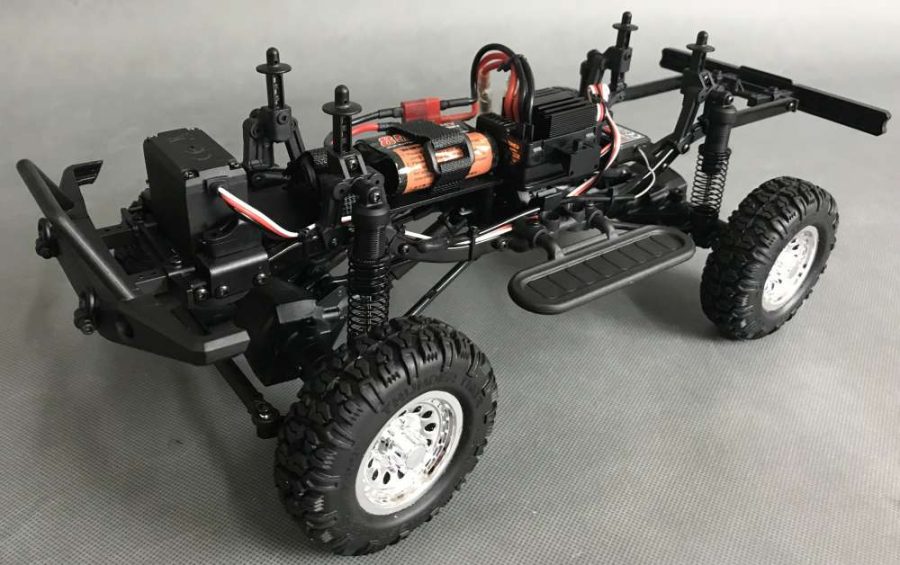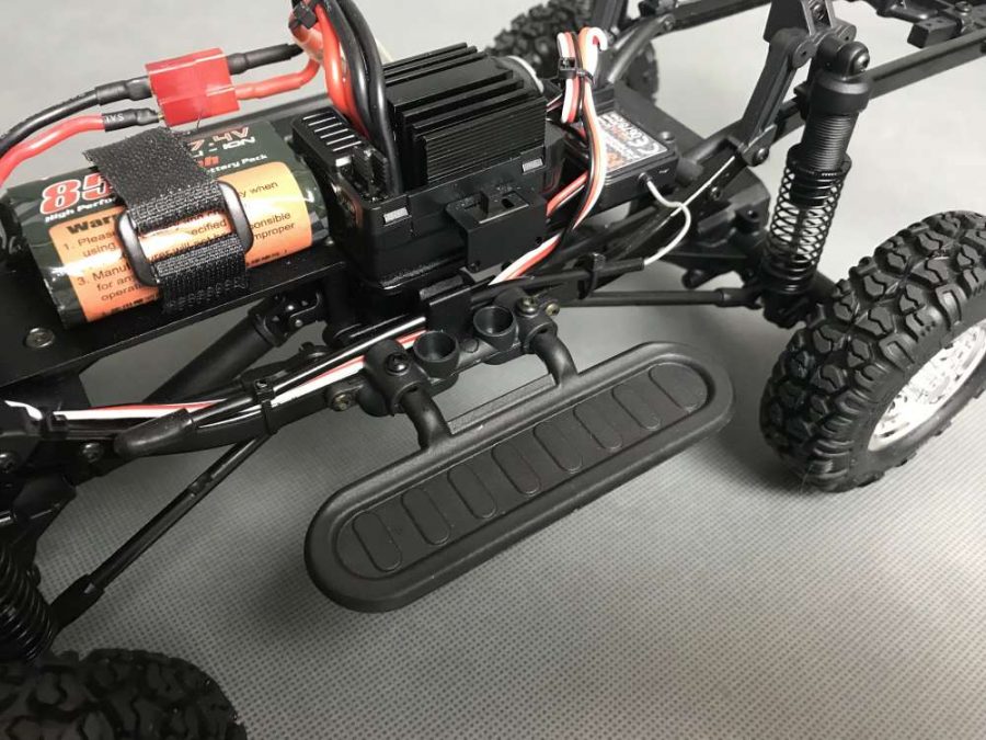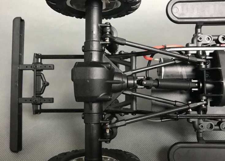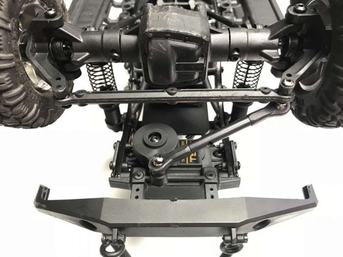 – Similar to the vast majority of trail trucks driving around the Thunder Tiger Toyota utilizes dual side rails that feature a c-channel design for righty and sturdiness. Composite cross braces, combined with a composite and functional skid plate that doubles as the transmission case bring the chassis together. Front and rear composite bumpers have the scale look trail truck fans like with the front bumper offering nice little tow-hooks.