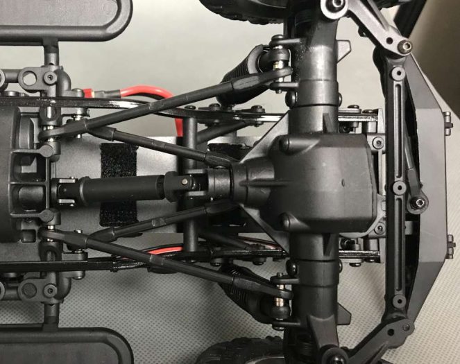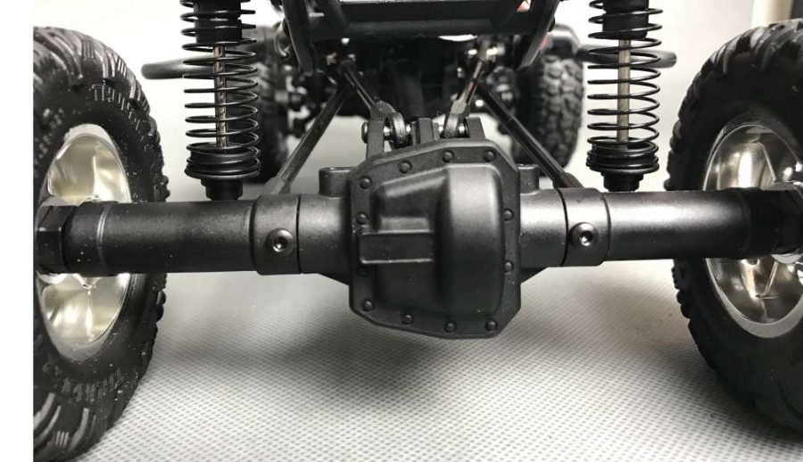 The 4-link front and rear solid axle suspension coupled with threaded plastic bodied coil-over oil filled shocks work very well together. There is good axle articulation for navigating bigger obstacles with relative ease as the suspension links, being made of metal, have little to no flex. Unfortunately, the shocks did leak a bit and did need to clean them and I changed the seals after testing.