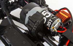At each corner are vented dBoots Copperhead 2 LP tires, molded of high-quality rubber and have an aggressive, chunky tread pattern. They come mounted for you on nice-looking black split spoke wheels. Handling the chore of turning the tires to match the transmitter’s input is a Spektrum high-torque S662 metal-geared digital servo. Other support gear consists of a Spektrum 3-channel SLT3 2.4GHz transmitter with dual protocol SR315 receiver and Spektrum Firma 120amp B2 waterproof speed control.