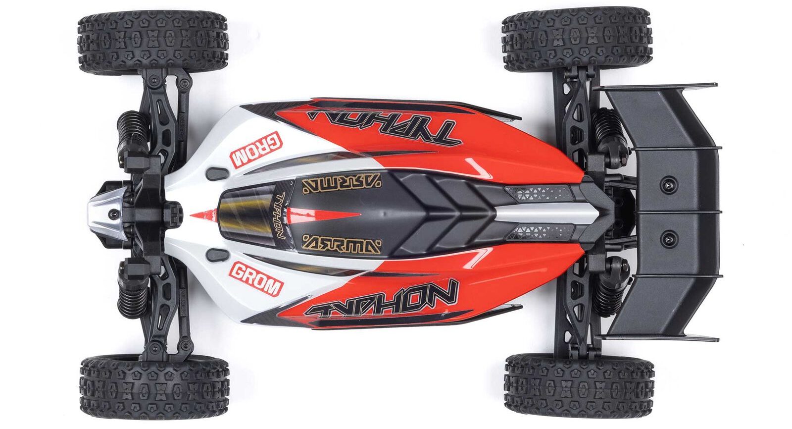The Arrma Grom 4WD platform is a rugged platform designed to take on rough terrain. Arrma offers the Grom setup in three configurations including the Granite Grom monster truck, the Mojave Grom desert truck and the Typhon Grom highlighted here. A Spektrum radio system comes as stock equipment including the waterproof metal geared steering servo and power is delivered by a 380 brushed motor that provides plenty of scoot with the paired 2S LiPo battery pack. Other features include independent suspension with oil-filled shocks, metal gear drivetrain, high-quality hex hardware and tough buggy wheels and tires.