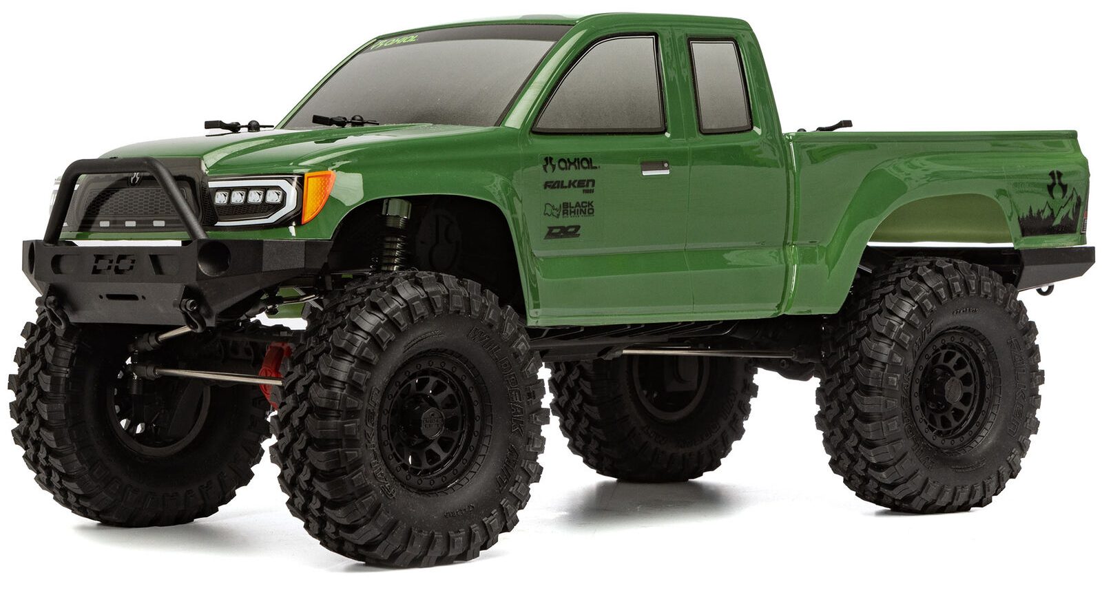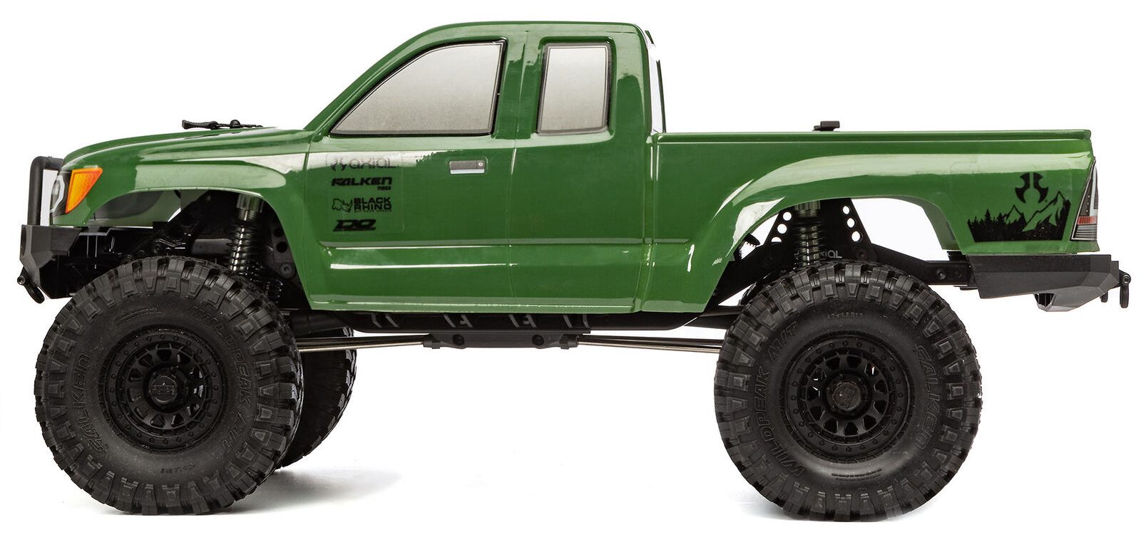 Axial offers the Base Camp in three configurations including a Builder’s Kit, a RTR version that comes with either a black or blue 1982 Chevy K10 body and the RTR version shown here that comes with either a blue, green or grey pickup body. As soon as it comes out of the box, you will be psyched to see it has a lean and classic design that offers plenty of scale realism. Under the body is the super capable SCX10 II chassis that can conquer the trails with its proven 4WD steel chassis. A single speed transmission equipped with a full set of ball bearings and all metal internal gears is strong and built for durability. Oil filled threaded body shocks support the solid axles while a Dynamite 35-turn brushed motor paired with a Spektrum 40amp ESC powers this rig. There are also licensed components like the Black Rhino wheels and Falken Wildpeak tires that give it scale good looks and performance.