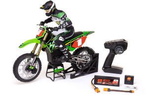 One of the key features that makes the Promoto-MX so special and an amazing performer is the 2700Kv brushless motor and steel flywheel. The motor spins the flywheel at 22,000 rpm that creates a gyroscopic force for unmatched stability even on rough off-road terrain. And there is more. The Spektrum MS6X technology receives that input from the transmitter and makes the Promoto-MX to lean, turn and control wheelies with unprecedented balance and finesse. Those are just the highlights of the features with many other things that make this RC vehicle exceptional.