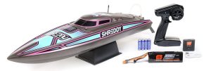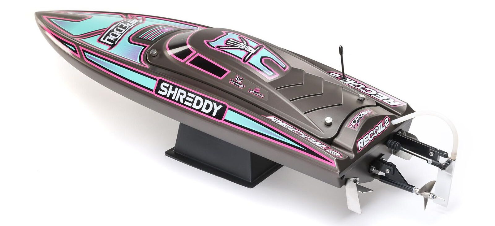 A Spektrum 3S 3200mah LiPo battery energizes the powerful Spektrum Firma 2300Kv brushless outrunner motor which makes the Recoil 2 very fast. And if you end up flipping the boat over. Don’t worry, because the hull is designed to be self-righting…a feature not found on many RC boats. Controlling the Recoil 2 is the Spektrum SLT3 3-channel 2.4GHz radio system along with a ProBoat waterproof servo to activate the rudder. There is also the choice of two different liveries.
