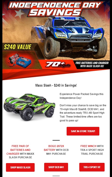 Traxxas Independence Day Savings Paul Onorato July 3, 2024 News Share tweet For more information, visit: TRAXXAS Related Posts:More AMain Hobbies Savings Available Throughout Cyber MondayAMain Hobbies President’s Day SaleHorizon Hobby Father’s Day DealsAMain Hobbies Set To Launch Its Biggest Black Friday…ProTek RC 1/10 & 1/8 Tool Sets With CaseTraxxas Holiday Sale Spotlight: 5 Must-Have RC… Share tweet