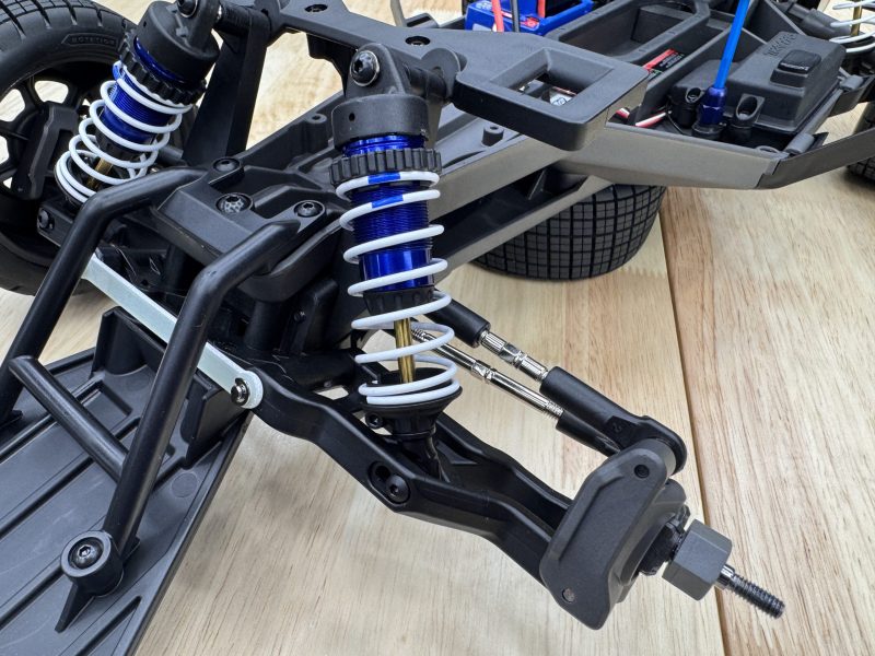 cks feature titanium-nitride-coated shafts and blue springs that balance responsiveness and control. Adjustable turnbuckles allow for fine-tuning camber and toe, though it’s race-ready as-is for most beginners. The spring-loaded servo saver adds a layer of protection while helping to preserve steering precision. Out of the box, the suspension setup feels dialed for oval work, giving the car the ability to float into corners and dig out with confidence.