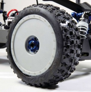 Time for some shoes! Ok, I wanted this to be a truck, but I also wanted the look and feel of an angry off-road racer. Because of this I felt 1/8-scale off road buggy tires and wheels would be best. No, they are not scale, but they sure do look cool! I felt the best all- around tire to accomplish this was the AKA Moto tires on DE Racing wheels. Since the wheels I went with featured 17mm hex adapters I also had to make the appropriate changes to the truck and had to pick up two different sets of adapters. One was for the rear where I used the XO-1 driveshafts and the other for the front where I kept the stock driveshafts.
