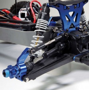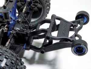 Since I was making this the 4-Pede ridiculously fast I knew I needed to beef it up substantially. I swapped out a handful of the stock plastic components for Traxxas after- market goodies including front C-hubs, knuckles, front and rear shock towers, hard anodized big bore shocks, a wheelie bar, motor mount, motor plate and sway bars just to name a few. On the back end I also beefed up the drive train a bit by adding the tough XO-1 driveshaft set and matching rear hubs. I went with the XO-1 driveshafts only in the rear because of the massive amount of power I was going to put through the truck and, being a wheelie machine; the rear drive- shafts would be seeing the majority of abuse.