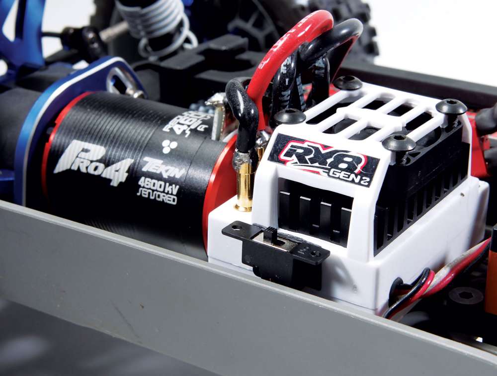 My goal with this project , if you have not already guessed, was to make a truck designed to pull some crazy wheelies or the other extreme handle on a track. So the first thing I looked to do was throw some massive power behind it. For this I looked to a Team Tekin RX8 Gen2 speed control and Pro4 4600Kv motor. The RX8 Gen 2 can take the abuse of 6S LiPo and since I was only planning to use a 3S LiPo I knew it was more than up to the task. I also really like that it can be custom programmed with the Tekin Hotwire. The Pro4 4600Kv motor is not designed to be used on 3S LiPo so if you are going to do this, beware! That said, this motor is plenty powerful, durable and an all-around performer. The stock servo was replaced in favor of a 1256TG servo from Savox. It is quicker and has more torque. Lastly I picked up a Team New Wave 4100mAh, 40C 3S hard case LiPo battery pack. New Wave packs perform exception- ally well and have a great price point.