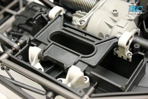 As you would expect, the trucks suspension bares a similar look to its full-scale counterpart. The Front double wishbone suspension has super rigid multi-piece lower arms and upper arms with long inner hinge pins that are held in with a screw on cap. There are some metal braces to help shore up the front suspension and increase durability. Cantilever type swaybars can be found on the front and rear to keep roll in check. The rear suspension consists of a four-link set-up to float the rear axle. The shocks are massive aluminum body GTR shocks. The main shock is threaded to adjust spring preload and the slave shock is even oil filled to damp the suspension.