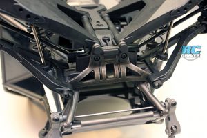 It’s obvious from the start that Traxxas build the UDR’s driveline with durability in mind to handle the 6S power system. The front and center differentials are built with steel gears and steel inserts make certain the gear shafts don’t “walk” through the case. The outdrives and output posts are heavy duty steel units. The front CV axles are also very robust and the aluminum center driveshaft with CV joints is pure eye candy. The short drive shaft from the center transmission to the front differential is composite but appears well built and should hold up to the power. One special part to note is the motor mount. To set gear mesh, there is a pin that can be placed in a number of spots that corresponds with the pinion gear size. This locates the mount in the perfect spot for the perfect mesh every time. Finally the wheel hexes are the Traxxas 17mm indexed hexes.