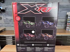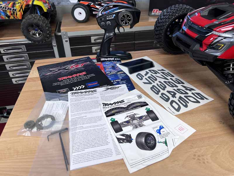 The box the XRT arrives in is much like the X-Maxx, however instead of the suspension being zip-tied down, the wheels are removed for shipping. The truck is available in 4 colors so make sure you check out the side of the box when selecting your truck. Beyond the assembled and painted truck, you’ll find a TQi radio, speed gears, tools, decals and manuals.