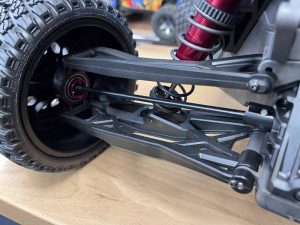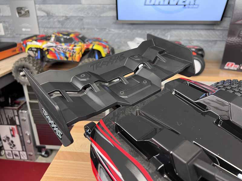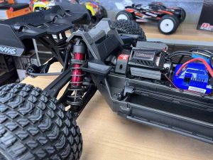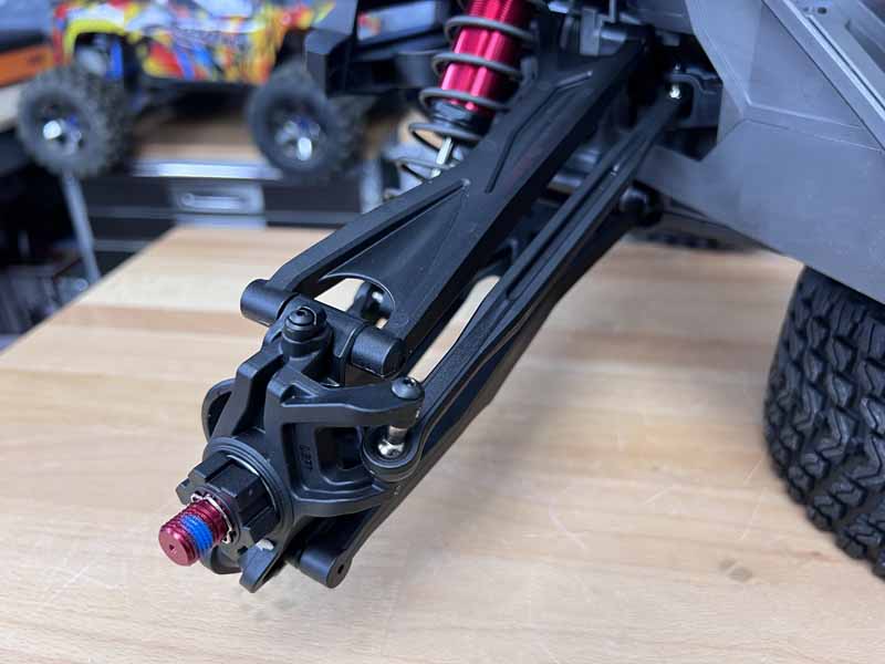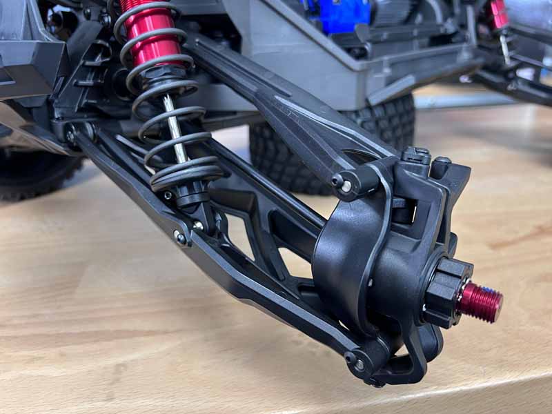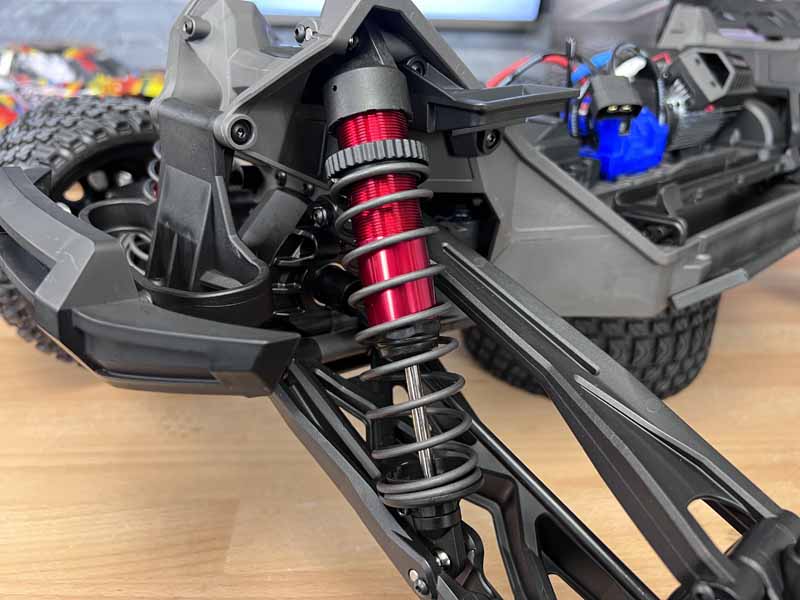 If the suspension looks similar to the X-Maxx, it’s because it is. Well, it’s the WideMaxx X-Maxx suspension arms. There are new shorter big bore shocks, new caster blocks, new steering knuckles and rear hubs. The springs on the shocks are the stiffest Traxxas has ever made.
