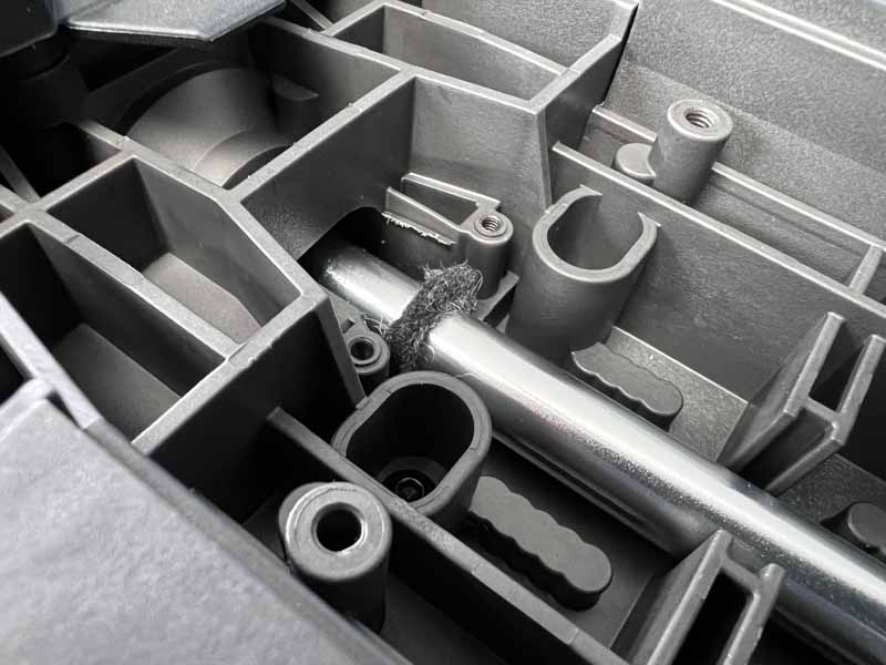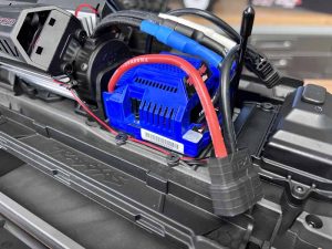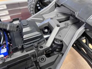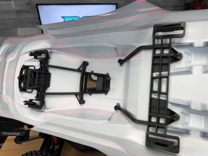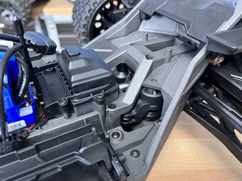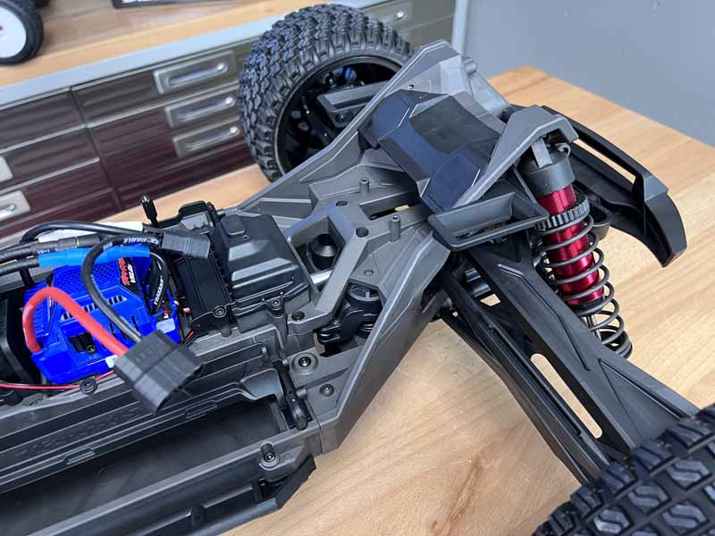 At first glance the chassis may look like an X-Maxx, but it’s a new set-up for a lower CG. The battery trays fit the 6700mAh Traxxas 4S packs. There’s plenty of bracing and the bulky shock towers are super rigid.