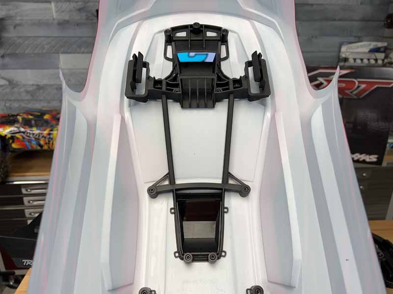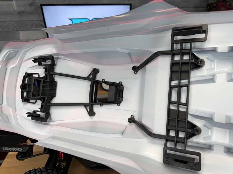 A wild truggy-like body sits on top of the chassis. It uses underside clips like the Traxxas TRX4 Bronco to hold it down. It has an built-in skeleton for protection and even air vents for cooling.