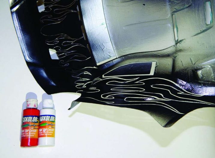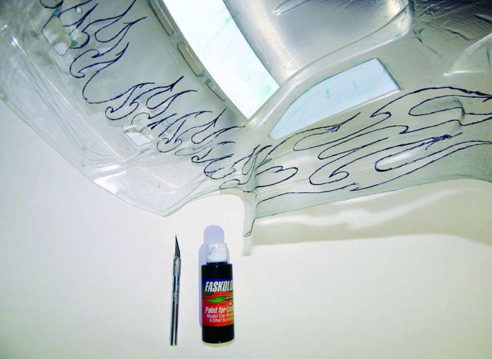 4 I cut out the graphics with my hobby knife. I use very gentle pressure as I do not want to score the body and create cracking points. Make sure you have a fresh blade in your knife as it will help with contours. This requires patience, so take your time. When the design was all cut out I carefully removed the mask from the flame area, and then filled with a couple of coats of FasBlack. I lay the first coat very light and then go in heavier with the second coat.
