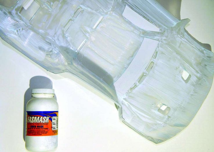 2 Now the body is trimmed and mounted but it needs to be cleaned before I start masking. I scrub it with some dish soap and warm water to remove any residual oils. Then I dry it with a lint free towel. I start masking by applying the included precut window mask. I apply them by tacking one corner in place with my thumbnail, then pulling it across and lining it up on a straight edge. I press it down along the edge and then remove the initial corner and reposition it. Then I apply the liquid mask with a one-inch foam brush in three coats, allowing a couple of hours in between, and overnight for the final coat to dry. With liquid mask, thicker is better, making it easier to remove.