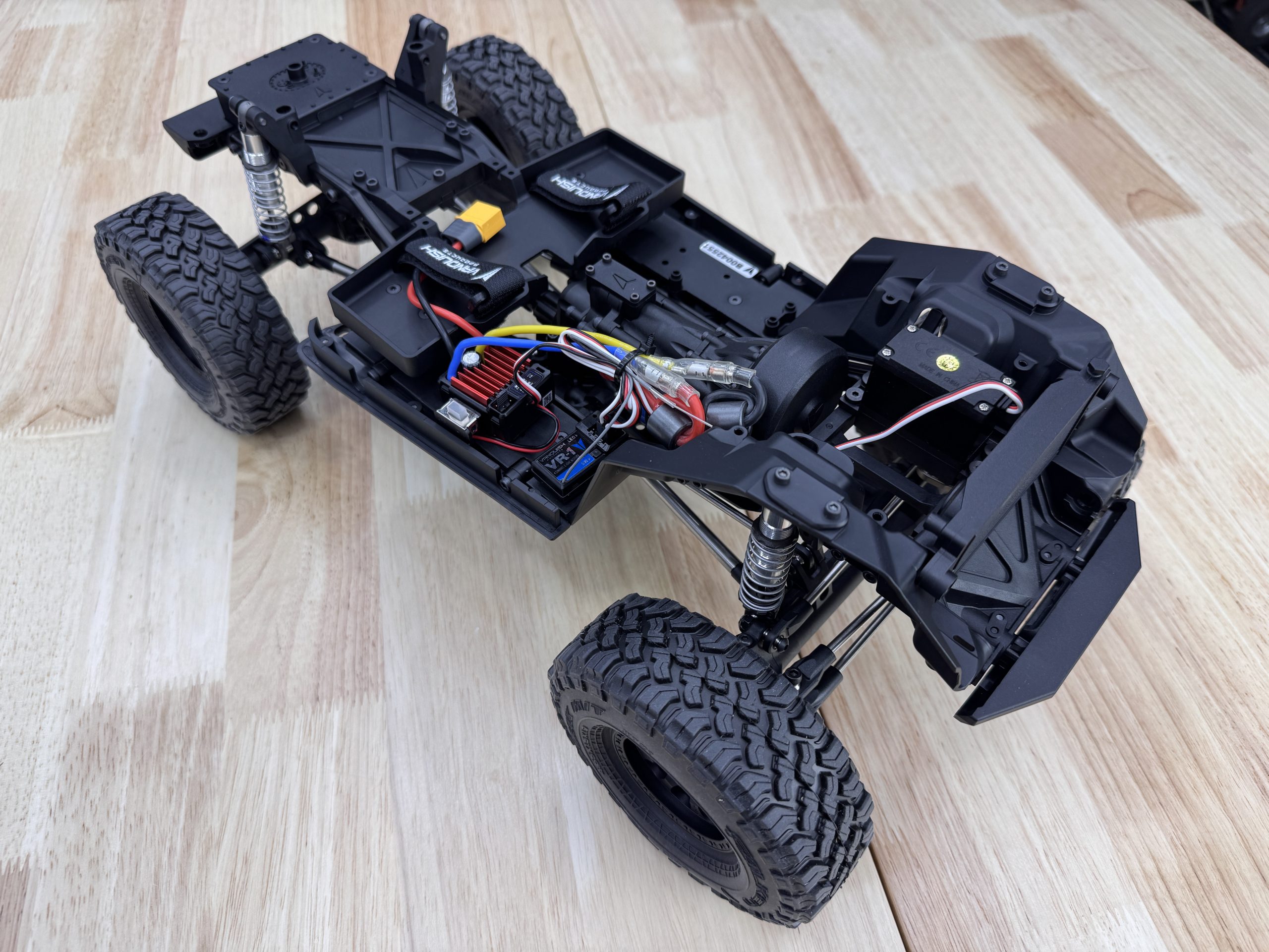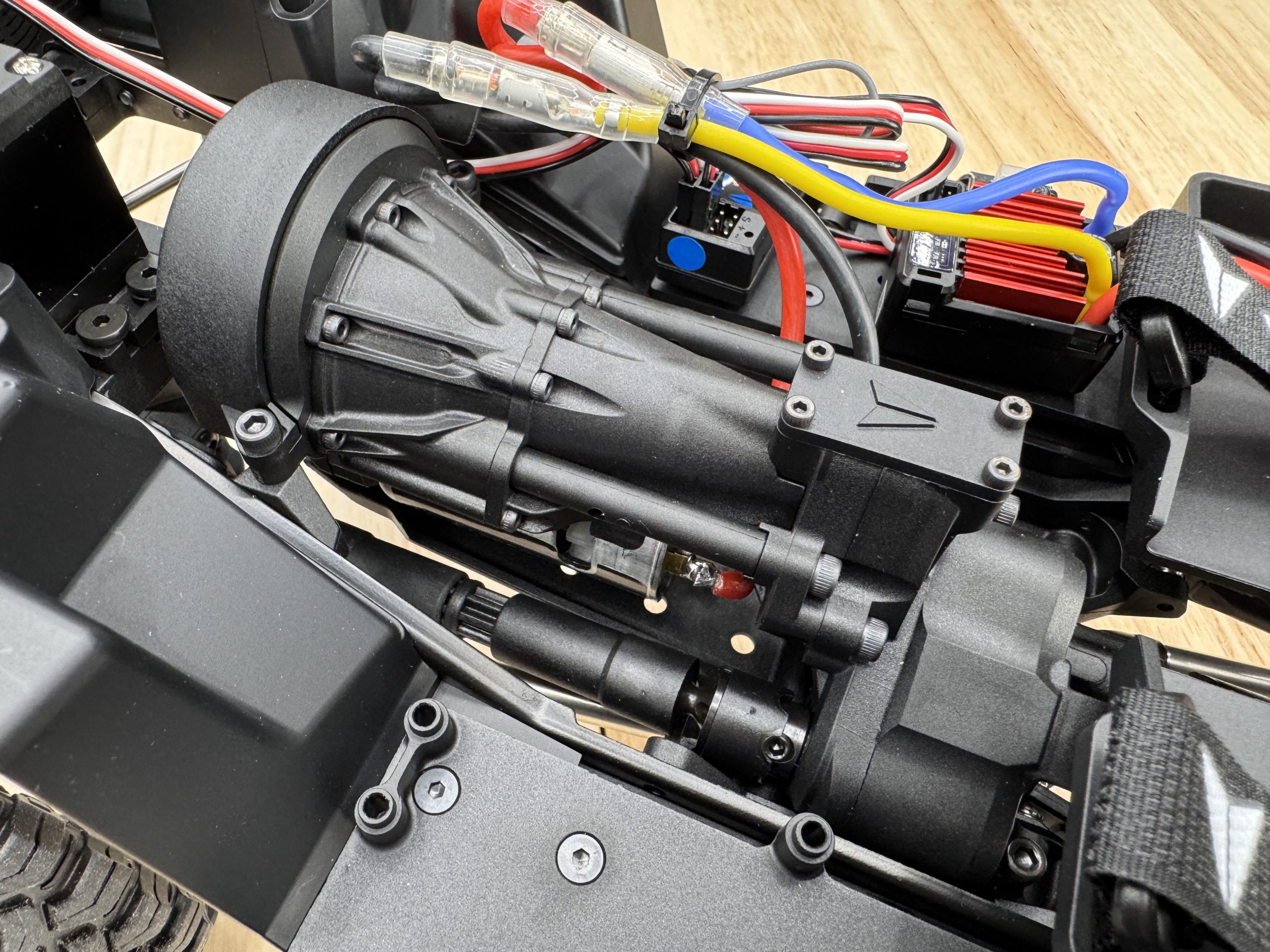 The heart of this RTR is the VFD transmission, tuned specifically for portal axles. Unlike the twin transmission in the straight-axle Phoenix, this version omits selectable overdrive and dig, but gains simplified durability with machined steel gears inside both the transmission and axles. The F10 portal axles add gear reduction, increased ground clearance, and brass inserts for strength. Pre-installed portal weights in the front help keep the nose planted on climbs, while the offset front differential improves driveline geometry. Add in low-mounted motor positioning and you’ve got a drivetrain designed for rock-crawling confidence.