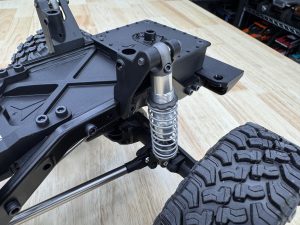 Vanquish addressed one of the biggest complaints from earlier Phoenix models—shock leaks. The Phoenix Portal introduces redesigned 80mm shocks with improved cartridges for durability. Suspension links are a mix of HD lower links with metal pivot balls and lighter upper links, steering rods, and panhard bar. While some enthusiasts may wish for HD links throughout, the overall suspension performance is smooth and responsive. Combined with portal axles, the suspension setup delivers articulation and clearance that are ideal for technical crawling.