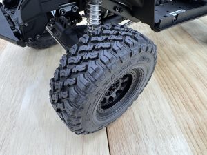 Vanquish includes three-piece beadlock wheels with Falken Wildpeak tires in their soft white compound. The beadlocks are practical for swapping tires but lack the aluminum rings seen on the straight-axle version. The Wildpeaks provide a nice balance of scale looks and trail performance, with a single-stage insert that allows noticeable tire flex for improved grip. They perform well in real-world testing, delivering consistent traction across rock, dirt, and trail conditions.