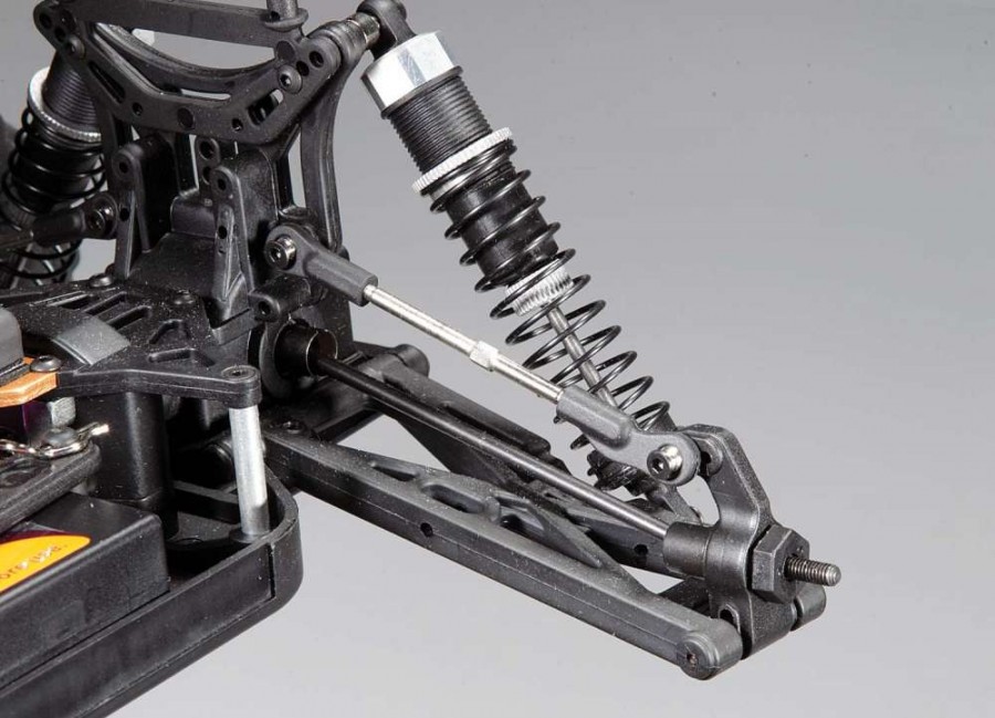 threaded collars. One cool feature about this truck is that every suspension setting is adjustable just like high end race kits. There are threaded steel turnbuckles all around and the A-arms even have droop screws, something not commonly found on RTR models (or monster trucks for that matter). There are also multiple shock mounting positions to further fine-tune the handling of the truck.