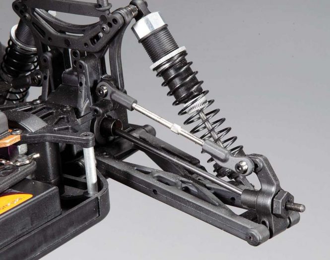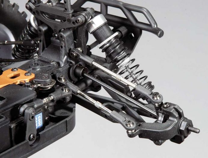 One of the standout qualities of the VRX line of trucks are the excellent big bore shocks that the vehicles are equipped with. These shocks are huge and look like they fit on 1/8-scale vehicles and have aluminum caps and feature adjustable ride height via threaded collars. One cool feature about this truck is that every suspension setting is adjustable just like high end race kits. There are threaded steel turnbuckles all around and the A-arms even have droop screws, something not commonly found on RTR models (or monster trucks for that matter). There are also multiple shock mounting positions to further fine-tune the handling of the truck.