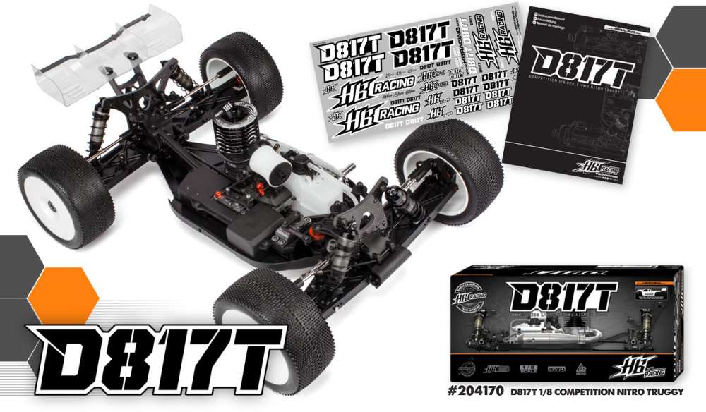 The D817T 1/8 scale nitro truggy from HB Racing features Race DNA from the IFMAR World Champion D817 buggy. It’s fine tuned with suggestions from our team drivers, built tough with machined aluminum and carbon graphite parts, highly adjustable for all suspension settings, and easy to work on. The D817T is a proven winner at race tracks around the world.