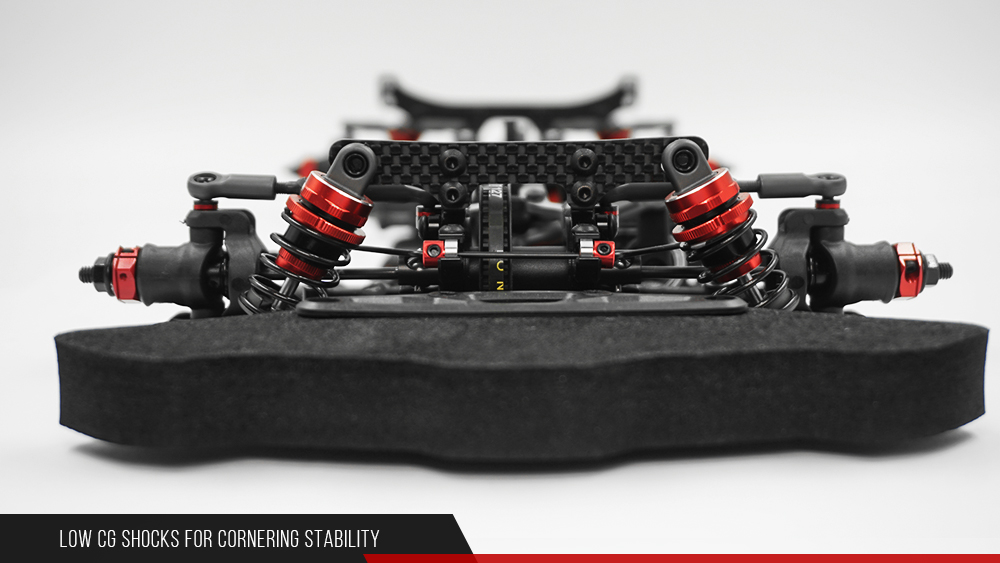 - Lowered positioned shocks allows a lower center of gravity for high cornering stability